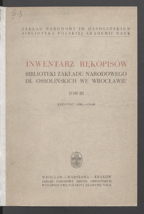 | Inwentarz rękopisów Biblioteki Zakładu Narodowego im. Ossolińskich we Wrocławiu. Tom 3, Rękopisy 11981-13000 | Sep 11, 2025 |