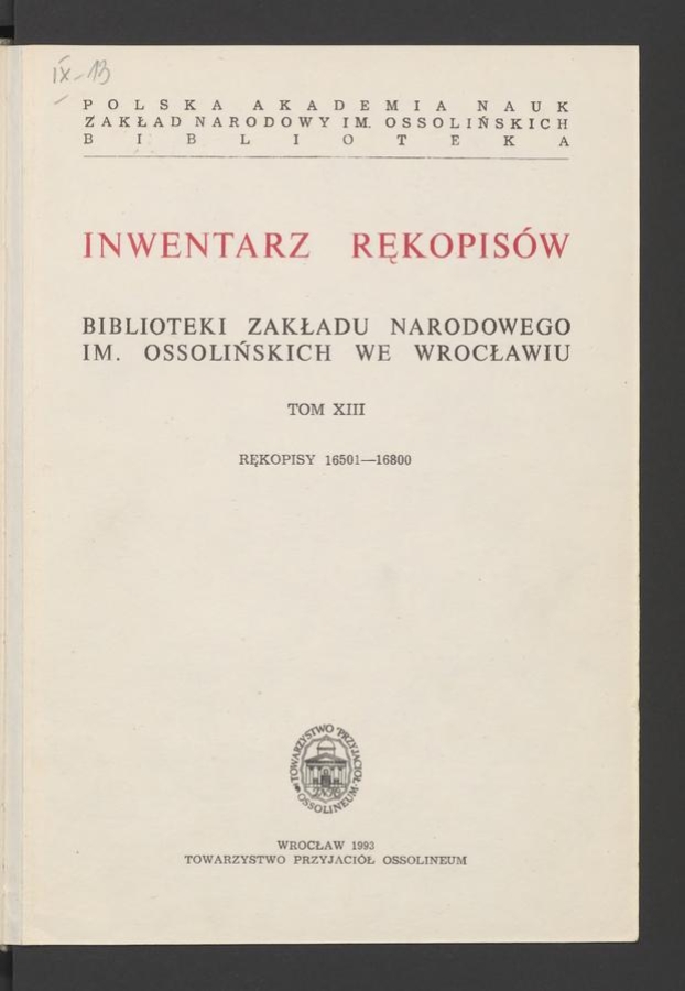 | Inwentarz rękopisów Biblioteki Zakładu Narodowego im. Ossolińskich we Wrocławiu. Tom 13, Rękopisy 16501-16800 | Sep 11, 2025 |